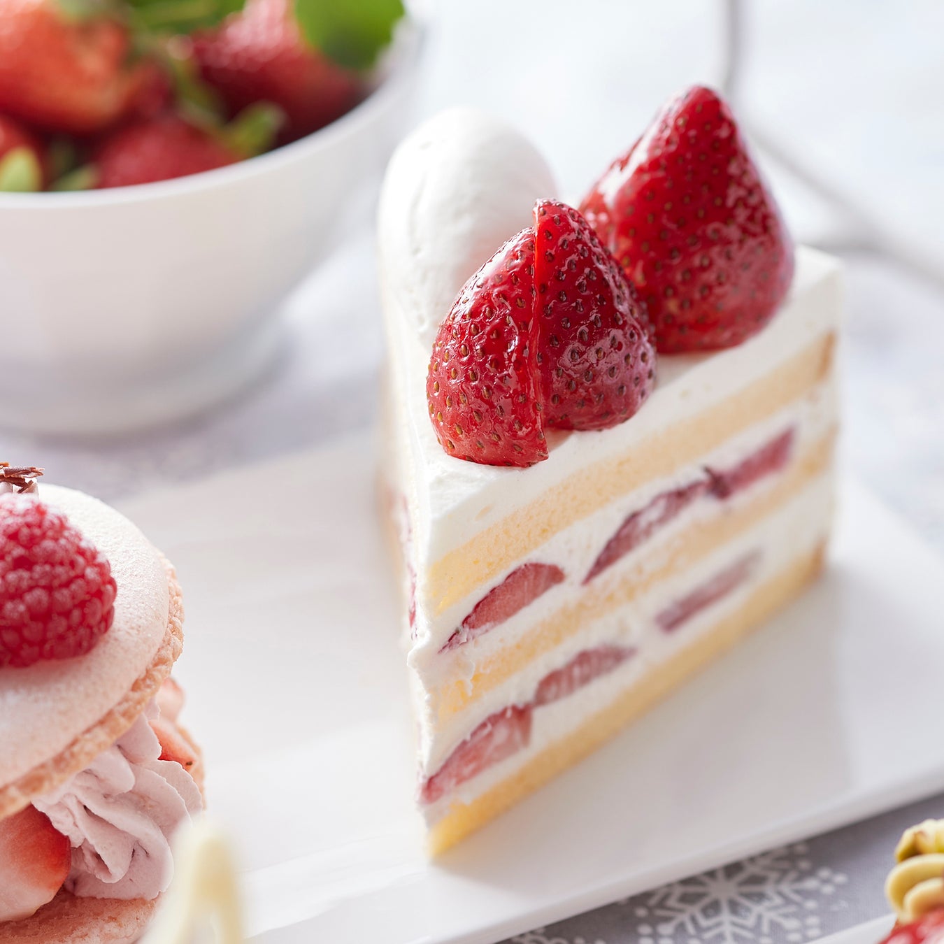北海道産の乳脂肪分が異なる純生クリームをブレンドしたクリームはコクがありながら後味は軽やかで、みずみずしい苺とふわふわスポンジ、三位一体の美味しさが魅力です。