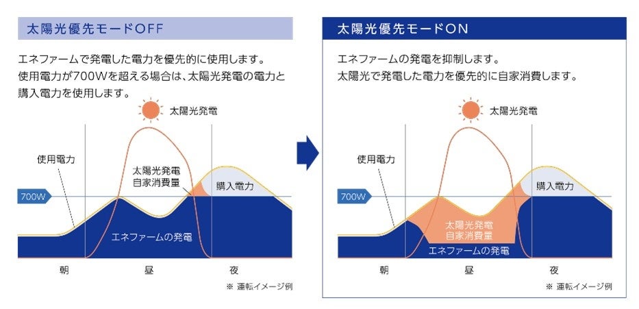 「エネファームtype S」の太陽光優先仕様では、太陽光優先モードを起動することで、太陽光の発電出力をリアルタイムで測定し、その出力に応じてエネファームの発電出力を自動で調整します。これにより、晴れや曇りの日の昼間はエネファームの発電を抑制し、太陽光で発電した電力を優先的に自家消費に回すことが可能になります。