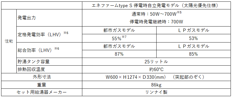 ※7 都市ガス13A(LNG)を使い約3時間以上安定して定格発電を継続した際の発電効率で、それ以外の定格発電効率は54%(総合効率87%)。都市ガス13A(国産天然ガス)、12A使用時の定格発電効率は54%(総合効率87%)。