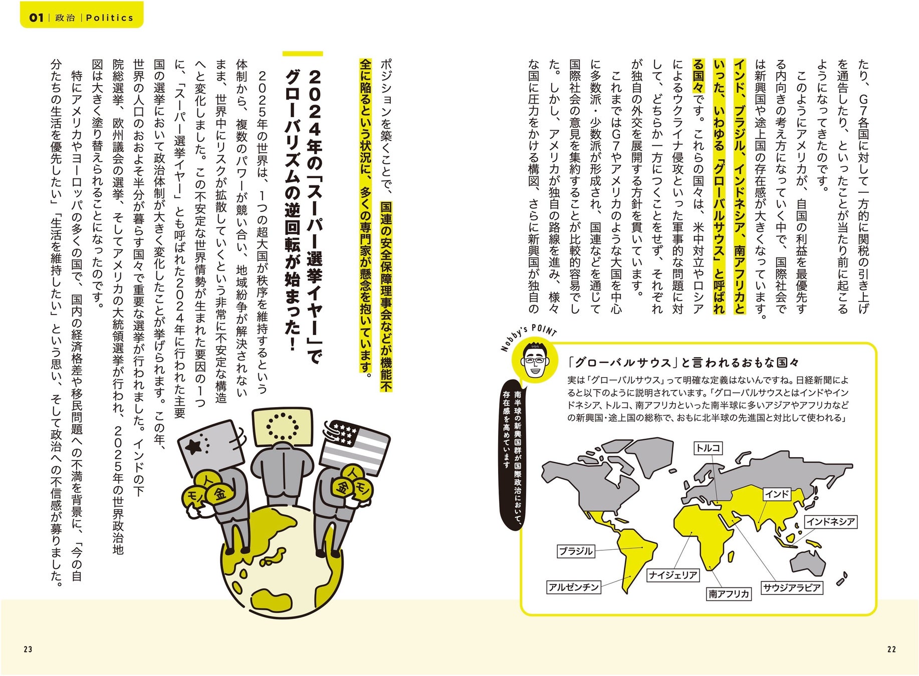 また、本書は2025年の主要ニュースを総ざらいした構成で、軽快な語り口による解説と、カジュアルなイラスト、デザインが特徴。