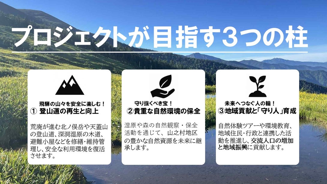 岐阜県飛騨市(市長:都竹淳也)ではこれまで、北ノ俣岳・天蓋山・深洞湿原周辺の登山道整備や自然観察会、ボランティアによる保全活動を市事業として継続してきました。しかし、山域は広く、老朽化した木道や登山道の洗掘対策、湿原保全に必要な費用・人員は年々増加しており、行政だけでは長期的な維持管理に限界があります。