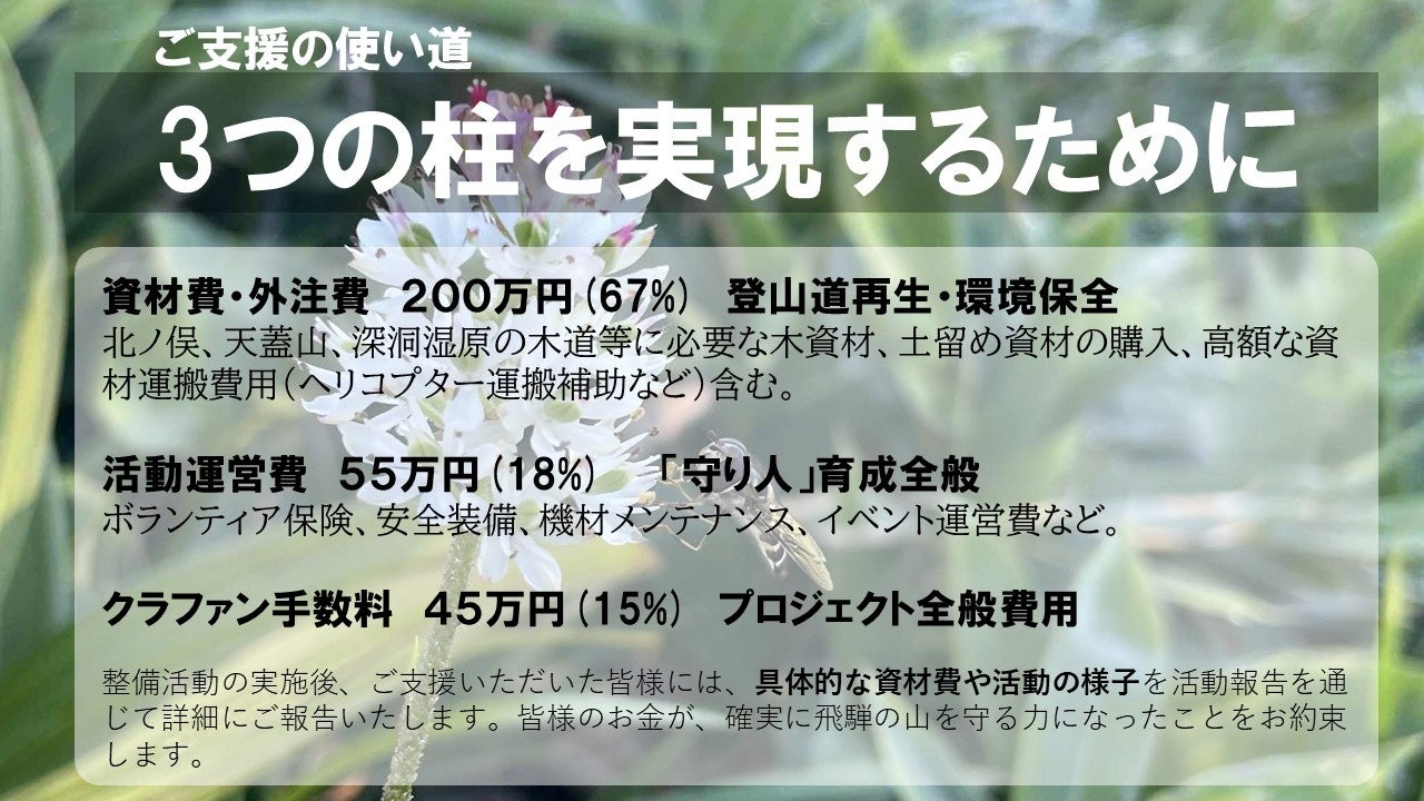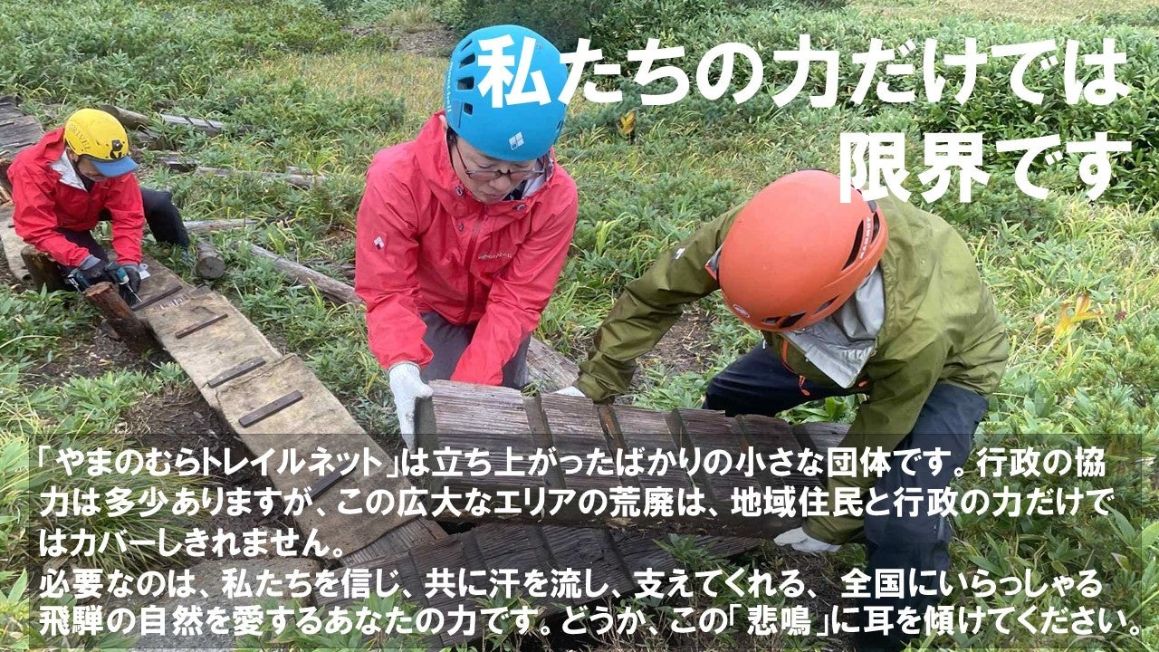 支援して終わりではなく、「支援した道を自分の足で確かめに来る」関係性を育てていきたいと思っています。飛騨の山々を愛する皆様、どうか力を貸してください。