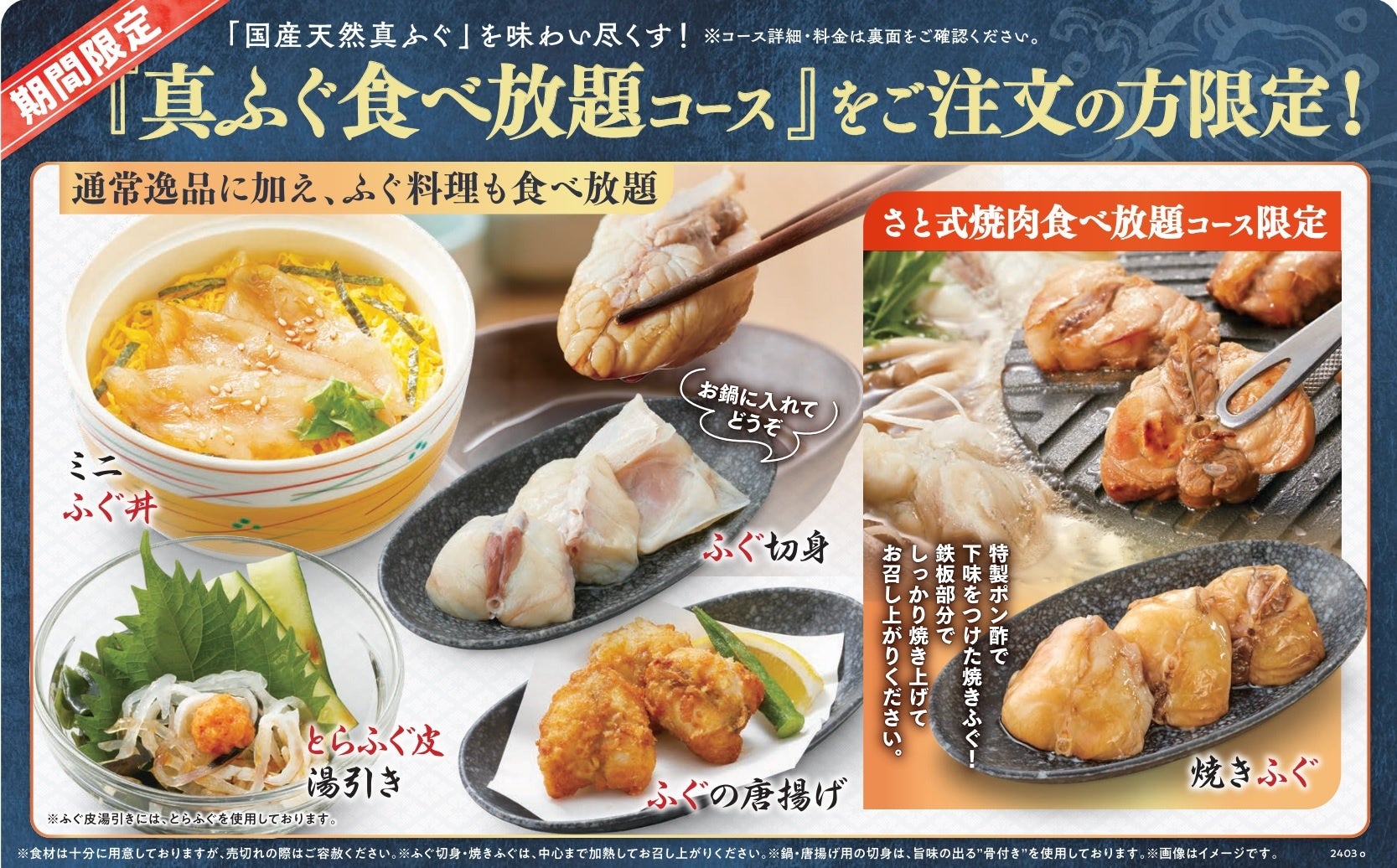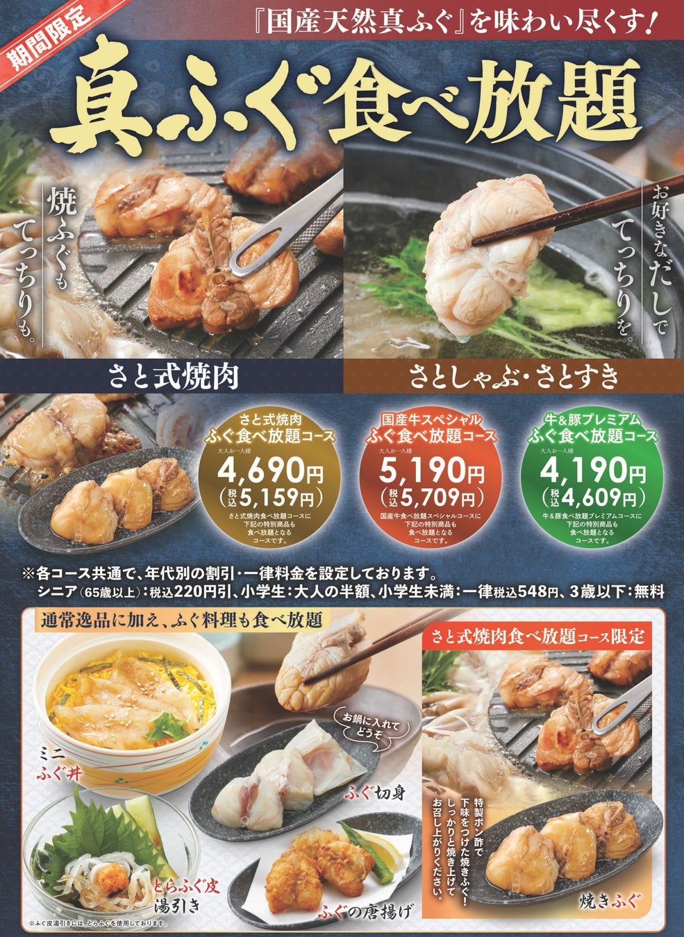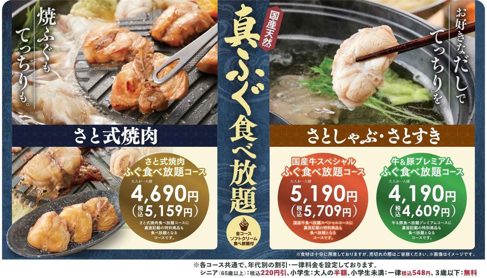 今回販売する食べ放題コースは、「さとしゃぶ/さとすき/さと式焼肉」に真ふぐ料理が食べ放題になる夢のようなコースです。