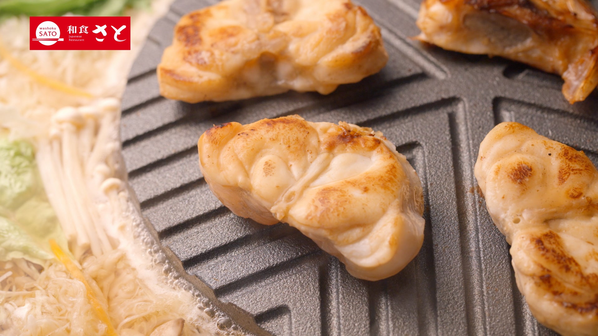 さと特製のポン酢で下味をつけた焼きふぐを鍋の上で焼くと、芳ばしい香りと共に焼きふぐならではのしっかりとした弾力の食感をお楽しめ頂けます。