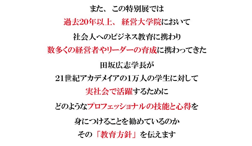 永年、多くの経営者やリーダーに多大な影響を与えてきた田坂広志が、未来を拓く若手人材の育成に向け、新たな学びの場を創造。学生のアートによる社会的メッセージと志ビジネスも展示