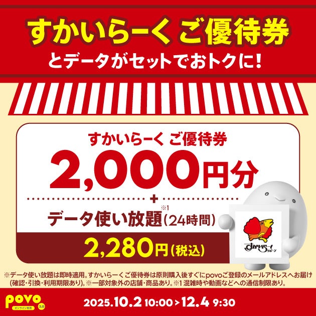 KDDI、沖縄セルラーは2025年10月2日から、povo2.0の「今だけのトッピング」として、「ガスト」、「バーミヤン」、「しゃぶ葉」など全国のすかいらーくグループ店舗で利用可能な「すかいらーく ご優待券2,000円分」と「データ使い放題(24時間)」(注)がセットになったトッピングを2,280円で提供します。データ購入とあわせて、すかいらーくグループでのお食事をおトクにご利用いただけます。