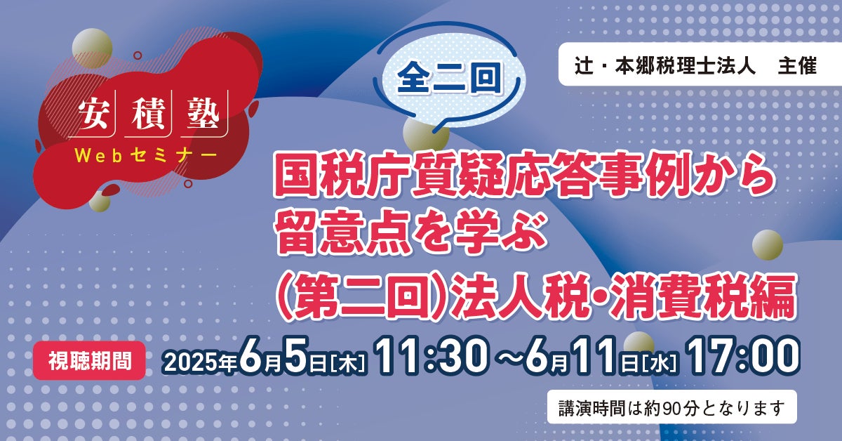 辻・本郷 税理士法人(本社:東京都新宿区、理事長:桑木小恵子)は、2025年6月5日(木)よりWebセミナー「【安積塾】全二回 国税庁質疑応答事例から留意点を学ぶ(第二回)法人税・消費税編」を開催いたします。第二回となる本セミナーでは、令和6年11月に更新された国税庁質疑応答事例の内容のうち、法人税及び消費税を中心に解説します。更新内容を確認したい方向けのセミナーです。