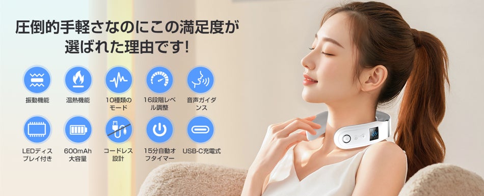 10種類のリフレッシュモードと16段階の強さ調整で、自分に最適なケアを選べます。初めての方は低めの強度から始め、徐々に強さを調整していくことができるので安心です。また、加温機能を搭載しており、寒い日に首元を温めることができ、冬のネックウォーマーとしても活用可能です。これ一台で、首元をトータルケアできます。
