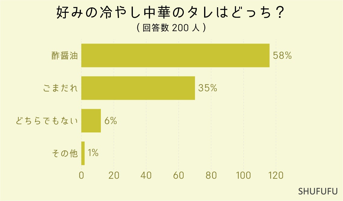 好みの冷やし中華のタレはどっちに関しては1位「酢醤油(58%)」、2位「ごまだれ(35%)」でした。さっぱりとした酢醤油の方が濃厚なごまだれよりも人気となりました。暑い時にはさっぱりしたタレが好まれるのかもしれませんね。