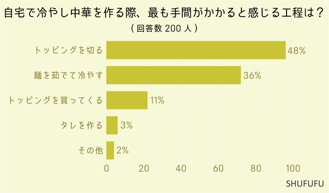 自宅で冷やし中華を作る際、最も手間がかかると感じる工程を尋ねたところ、1位は「トッピングを切る(48%)」、2位「麺を茹でて冷やす(36%)」となりました。複数のトッピングを同じくらいの長さで細切りにしないといけないので大変ですよね。