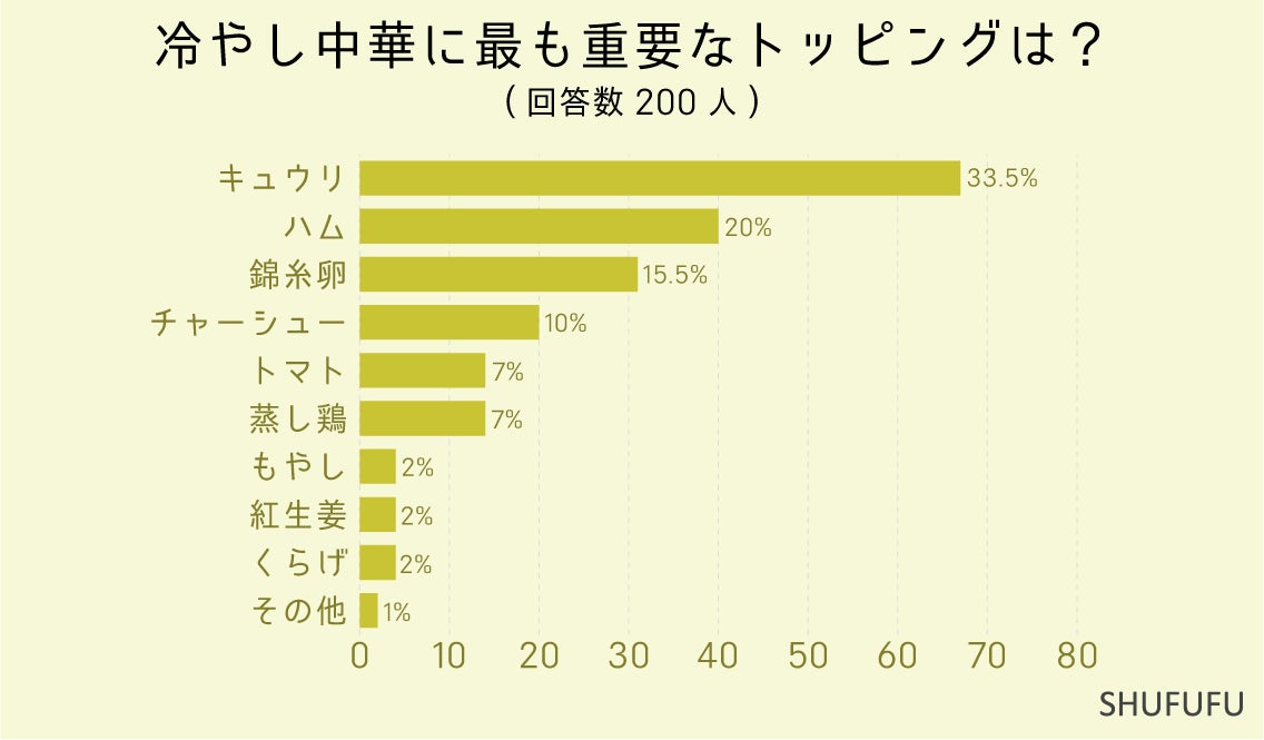 冷やし中華に最も重要なトッピングを尋ねたところ、1位は「キュウリ(33.5%)」、2位「ハム(20%)」となりました。きゅうりとハムは市販の冷やし中華セットのイメージ図にもほとんど必ず乗っているイメージなので上位なのも納得ですね。