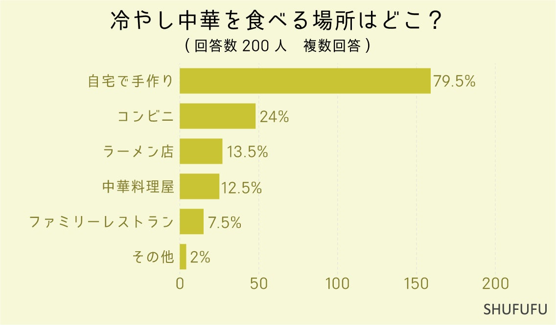 冷やし中華を食べる場所を尋ねたところ、1位は「自宅で手作り(79.5%)」、2位「コンビニ(24%)」となりました。8割近い方が「自宅で手作り」する結果になりました。スーパーなどでも麺を茹でてトッピングを乗せるだけで食べられる商品も売ってあるので簡単に作れて便利ですね。