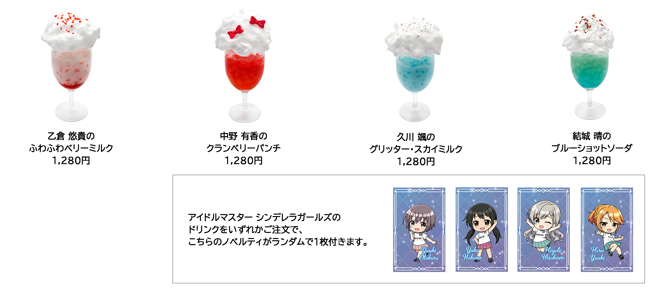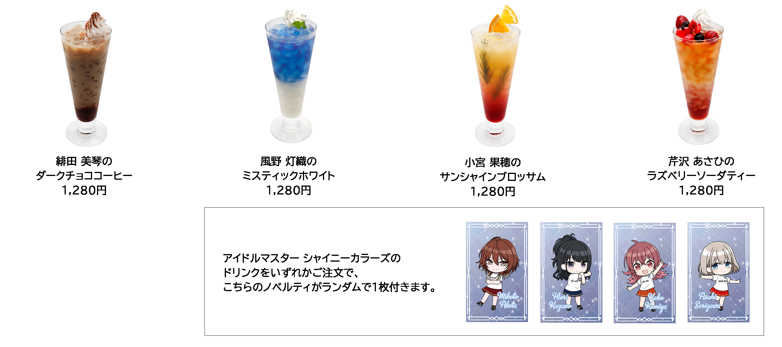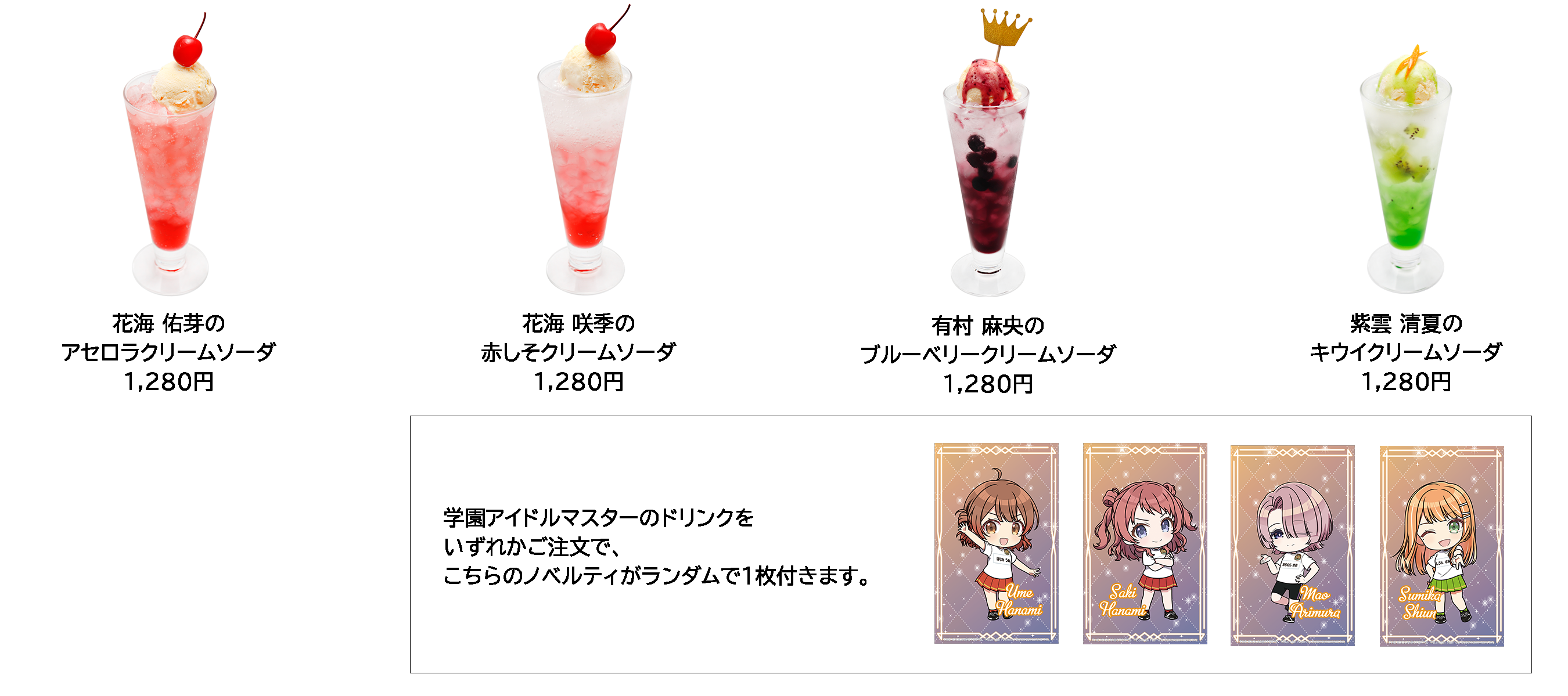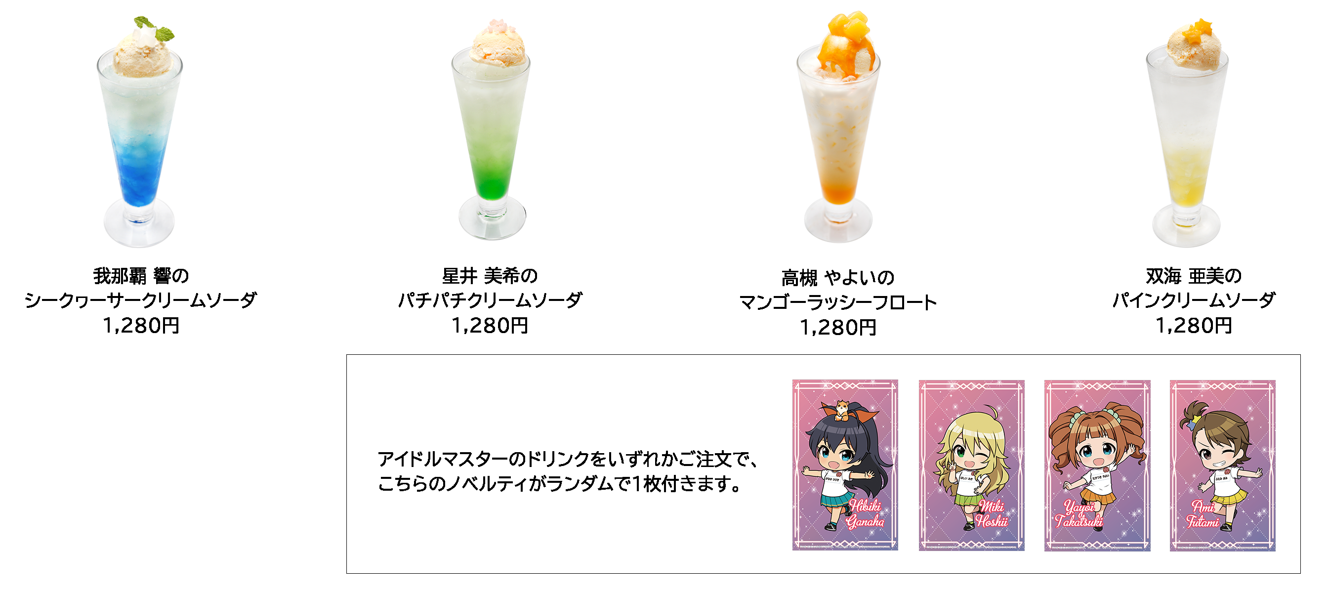 描きおろし6名のイラストと描きおこし24名のイラストを使用したオリジナルグッズ展開のほか、はずれなしのオリジナルミニゲーム「チアフルアンサンブル デジタルミニゲーム~響と一緒に!目指せ1等賞!~」を実施。映像や音楽と一緒に飲食を楽しめる「MUSIC&PLAYLOUNGE『ASOBINOTES』(アソビノオト)」では、今回登場するアイドルをイメージしたオリジナルドリンク(ノンアルコール)や『アイドルマスター』シリーズの各ブランドをイメージしたフード、TAG LIVE LABEL(ラベル缶)を展開します。