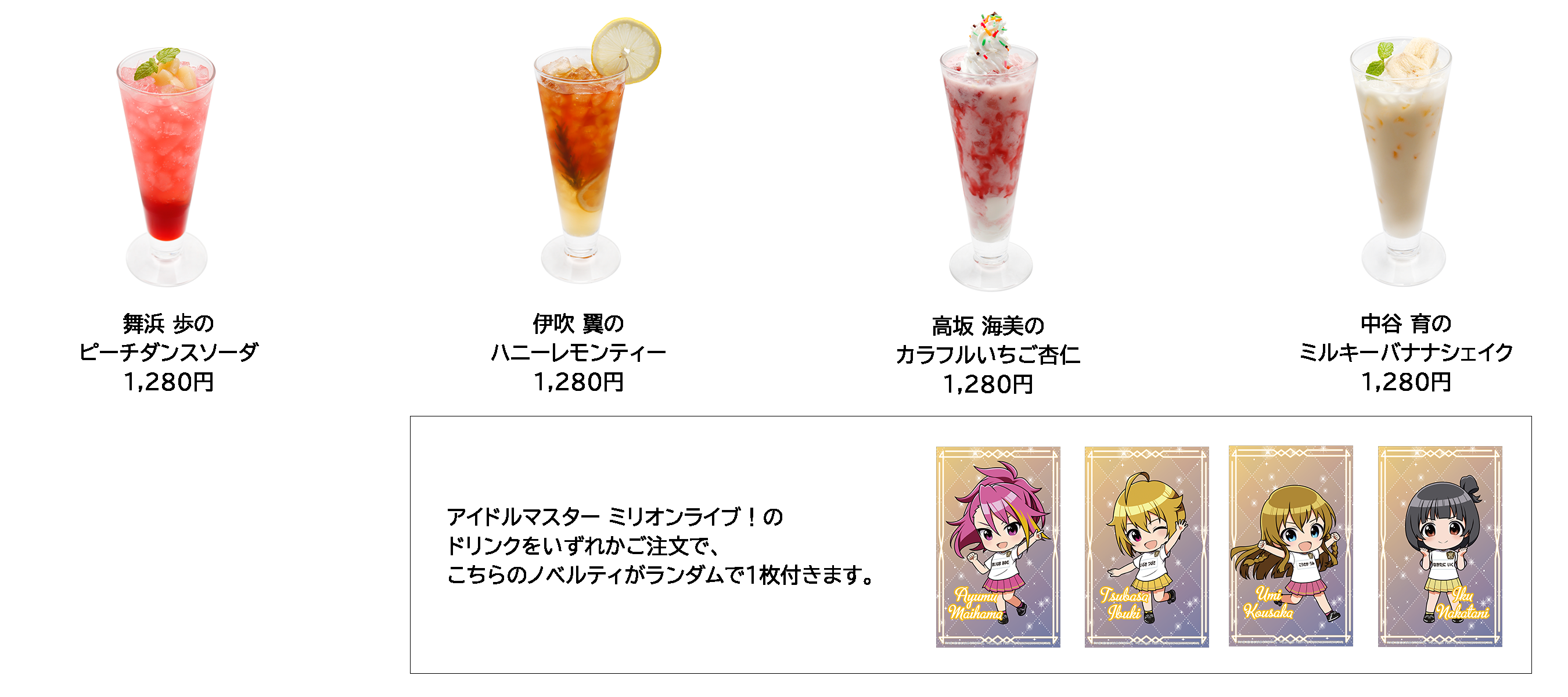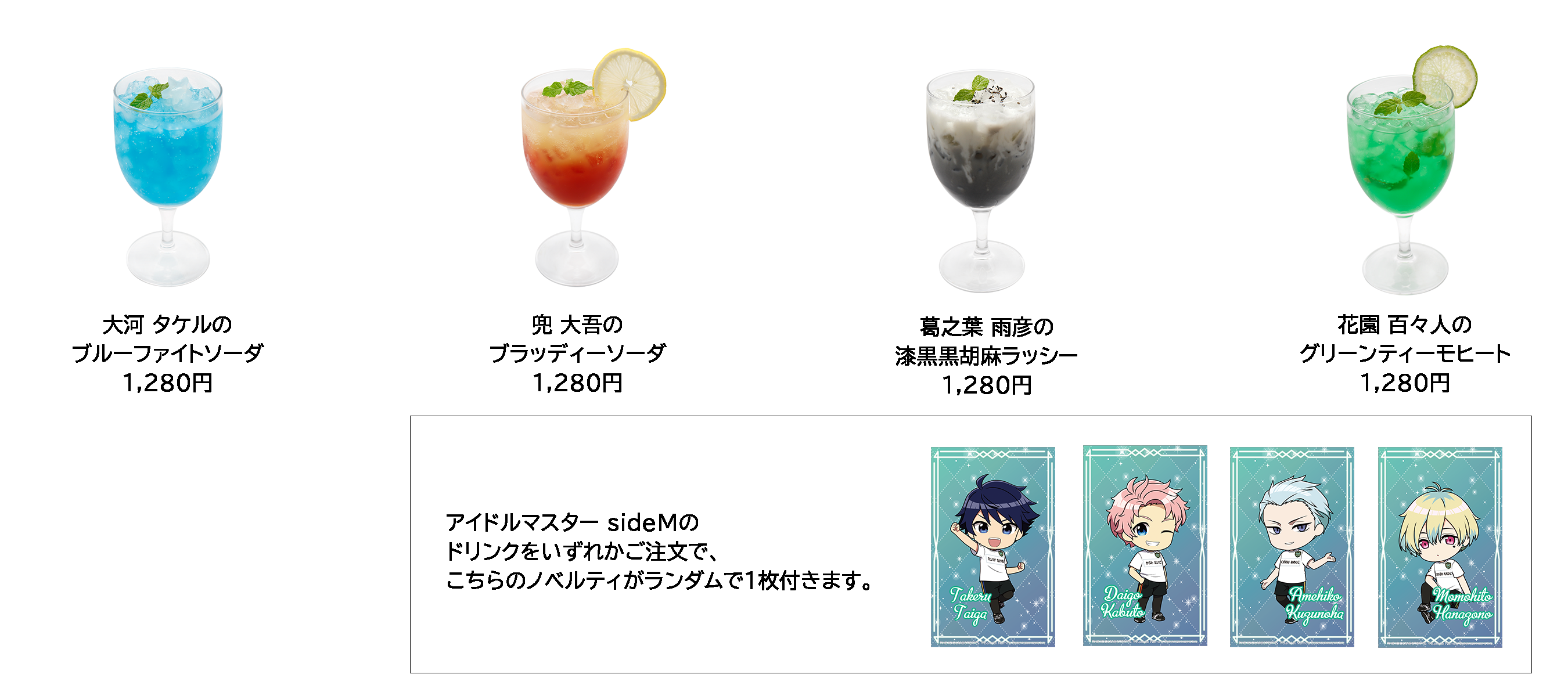 フロア内飲食スペースの「MUSIC&PLAYLOUNGE『ASOBINOTES』(アソビノオト)」では、本イベントに登場するアイドル24名をそれぞれイメージしたオリジナルドリンクが楽しめます。さらに施設内の大型モニターにイベント期間中にお誕生日を迎える3名のアイドル「星井美希」「中谷 育」「大河タケル」をお祝いする映像をそれぞれのお誕生日当日に投影します。お誕生日の記念にぜひコラボメニューと一緒にお楽しみください。