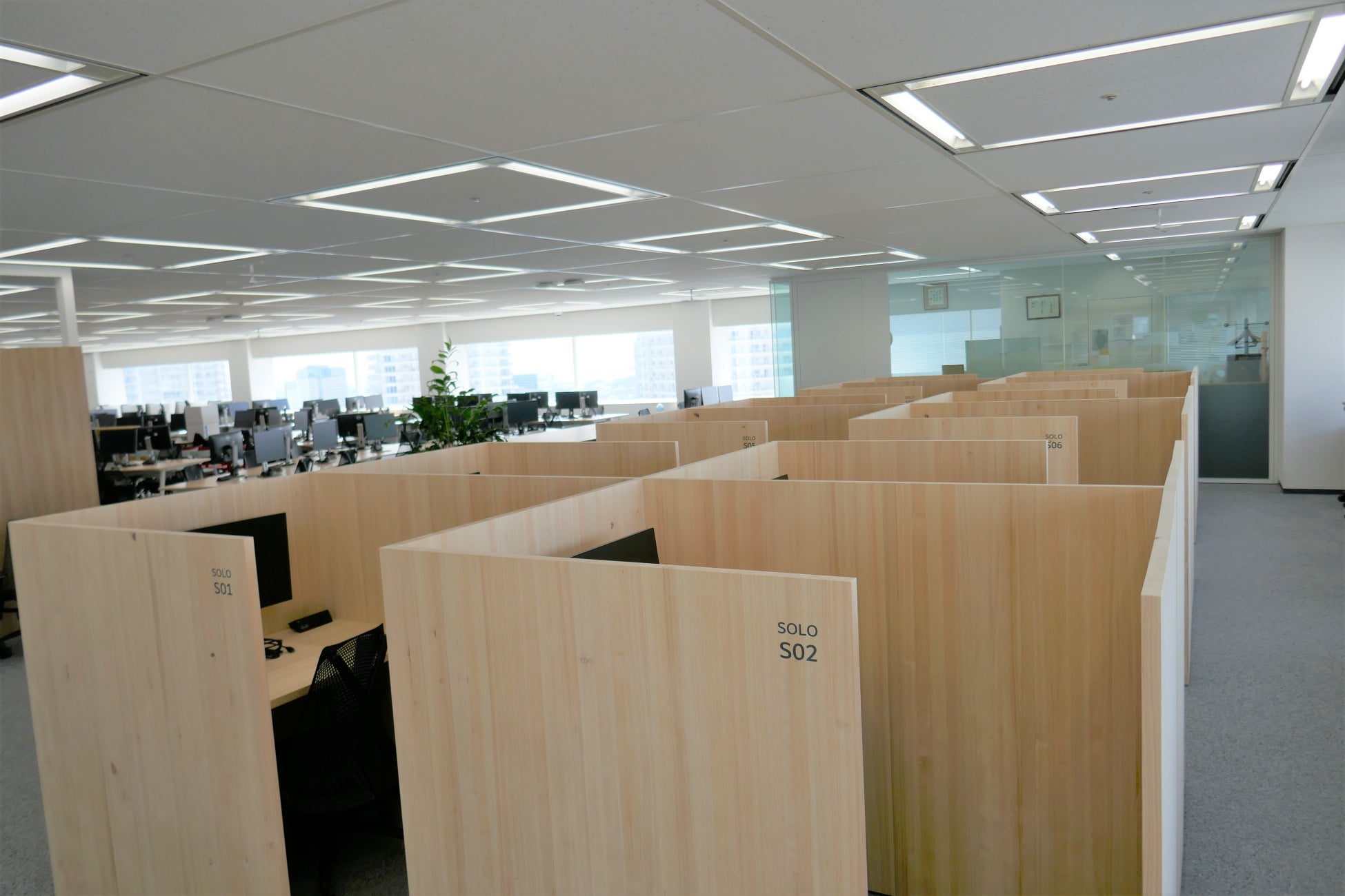 ・執務室には少人数で使えるオープンミーティングスペースや個人集中ブースを増設。集中時と協働時の切り替えがしやすくなる自律分散型の働き方を推進