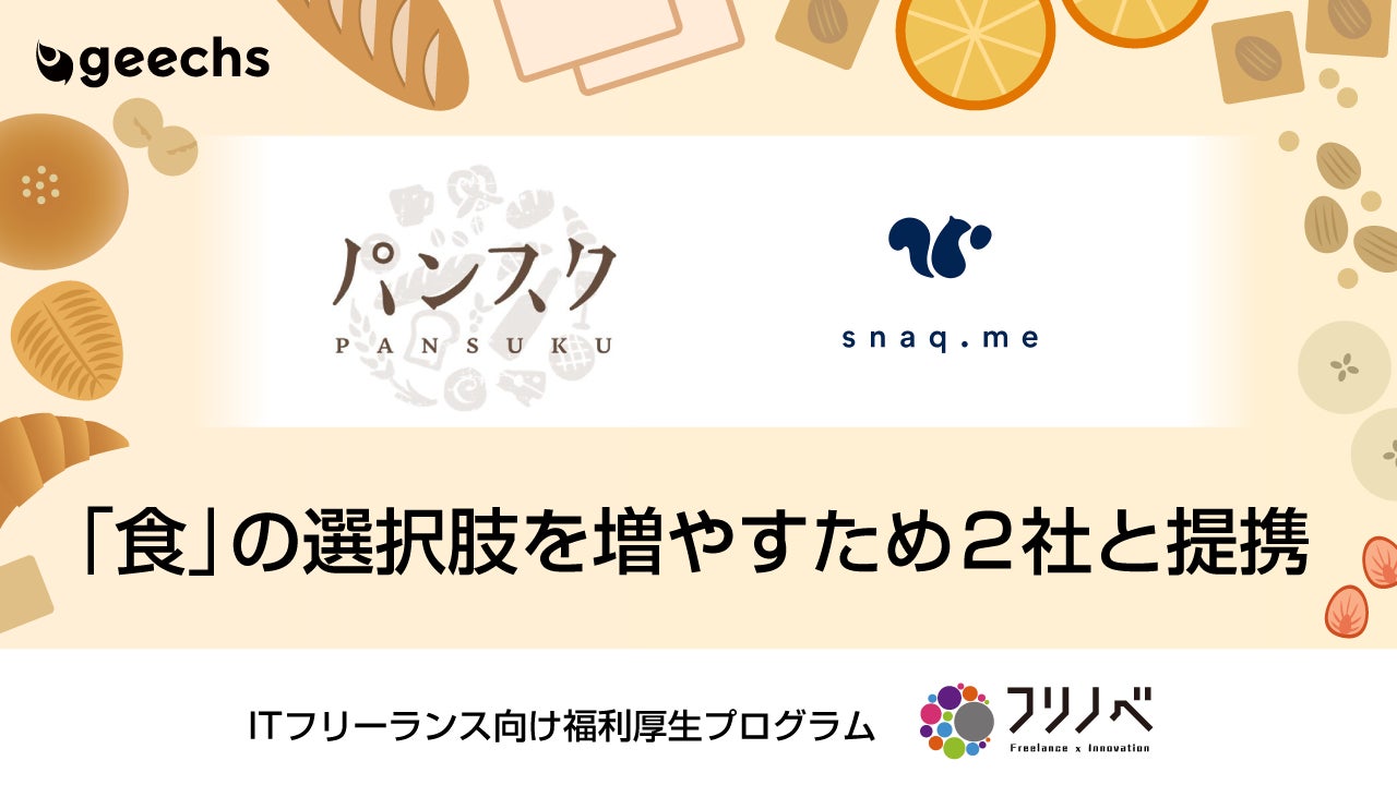 ITフリーランスの働き方を支援し、企業とIT人材をマッチングするサービスを展開するギークス株式会社(本社:東京都渋谷区、代表取締役CEO:曽根原 稔人、以下ギークス)は、ナチュラル素材のみからできたおやつの定期便「スナックミー」を運営する株式会社スナックミー(本社:東京都中央区、代表取締役:服部 慎太郎、以下スナックミー)、全国のパン屋さんから焼きたてを冷凍したパンが届く定期便「パンスク」を運営する株式会社パンフォーユー(本社:群馬県桐生市、代表取締役:矢野 健太、以下パンフォーユー)と提携したことをお知らせします。