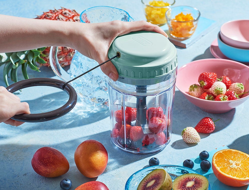 今回新しくシリーズに加わるのは、キッチンで場所をとらずに収納できるスリムタイプ。とかく物が多くなりがちなキッチンに嬉しい、ちょっとしたスペースにも収まるサイズです。また、食材をパワフルにカットするので、これまで手動式のハンディチョッパーでは難しかった、市販の冷凍フルーツなどを使ったフローズンドリンクもおうちで楽しめます。