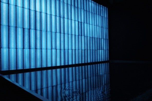 透過性のある素材に浮かび上がる微細な表情は、ボトルが辿ってきた歴史を示し、アップサイクルされた建材としての次の可能性を示唆しています。
