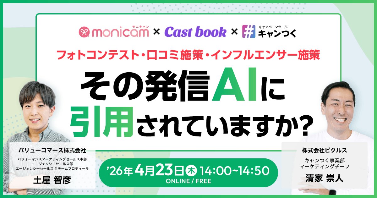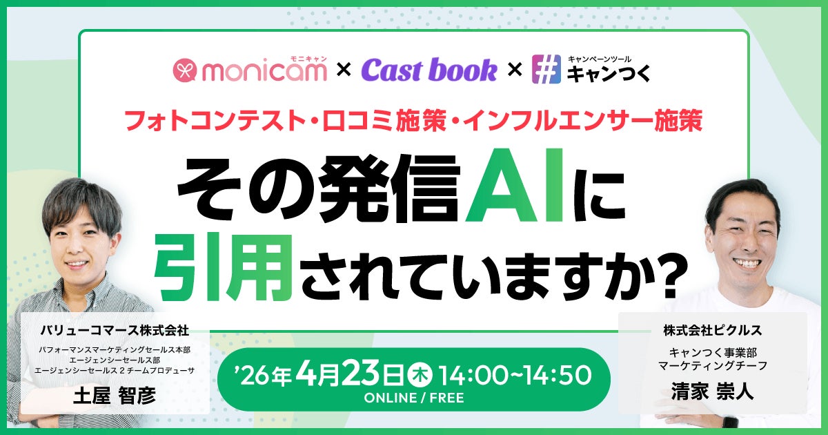 株式会社ピクルス(東京都品川区、代表取締役 田中 稔、以下「ピクルス」)は、バリューコマース株式会社(東京都千代田区、代表取締役社長 香川 仁、以下「バリューコマース」)と共催で、2026年4月23日(木)14:00よりオンラインウェビナー「その発信、AIに引用されていますか?〜ChatGPT・Gemini・Perplexityに"選ばれる"3つのSNS設計〜」を開催いたします。