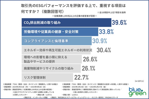 「取引先のESGパフォーマンスを評価する上で、重視する項目は何ですか?(複数回答可)」と質問したところ、『CO₂排出削減の取り組み(39.6%)』が最も多く、次いで『労働環境や従業員の健康・安全対策(33.8%)』『コンプライアンスと倫理基準(30.9%)』となりました。