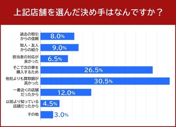 車を売る店を選んだ決め手について質問したところ、30.5%の方が「他店よりも買取額が高かったから」と回答しました。