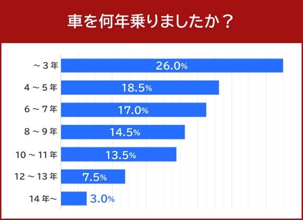 「車を何年乗りましたか」という質問では、「~3年」と回答した方が26%と最も多い結果となりました。次いで「4年~5年」と回答した方が18.5%、「6年~7年」と回答した方が17.0%となっています。