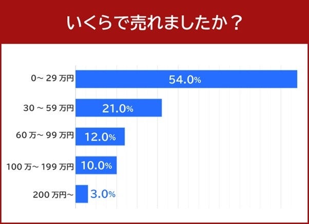 車がいくらで売れたか質問したところ、54%の方が「0~29万円」と回答しました。約半数の方が29万円以下の価格で売れたことが分かります。
