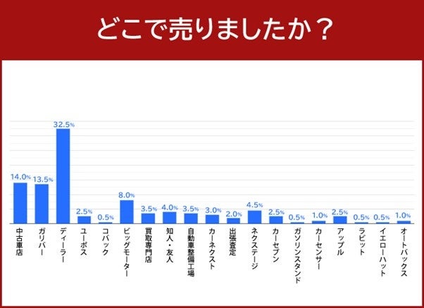 車を売ったお店について質問したところ、「ディーラー」と回答した方が32.5%と最も多い結果となりました。