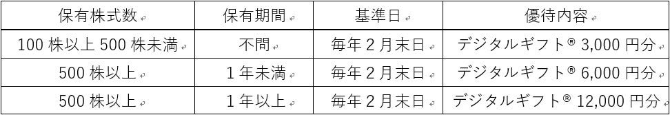 バリュークリエーション株式会社の株式100株以上を保有されている株主様へ向けた株主優待として、デジタルギフト®を優待品目としてご導入いただきます。株主様は、交換先の中からお好きな優待品目を選択することができます。