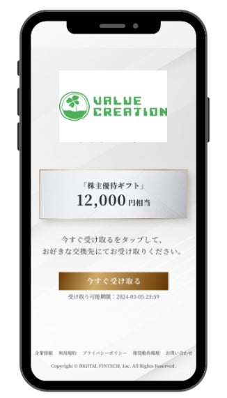 バリュークリエーション株式会社(代表取締役社長:新谷 晃人、東証グロース市場:証券コード9238)において、株式会社デジタルプラス(代表取締役社長:菊池 誠晃、本社:東京都渋谷区、東証グロース市場:証券コード3691)の子会社である、株式会社デジタルフィンテック(代表取締役社長:菊池 誠晃、本社:北海道札幌市)が運営する「デジタルギフト®」を株主優待としてご活用いただくことになりました。