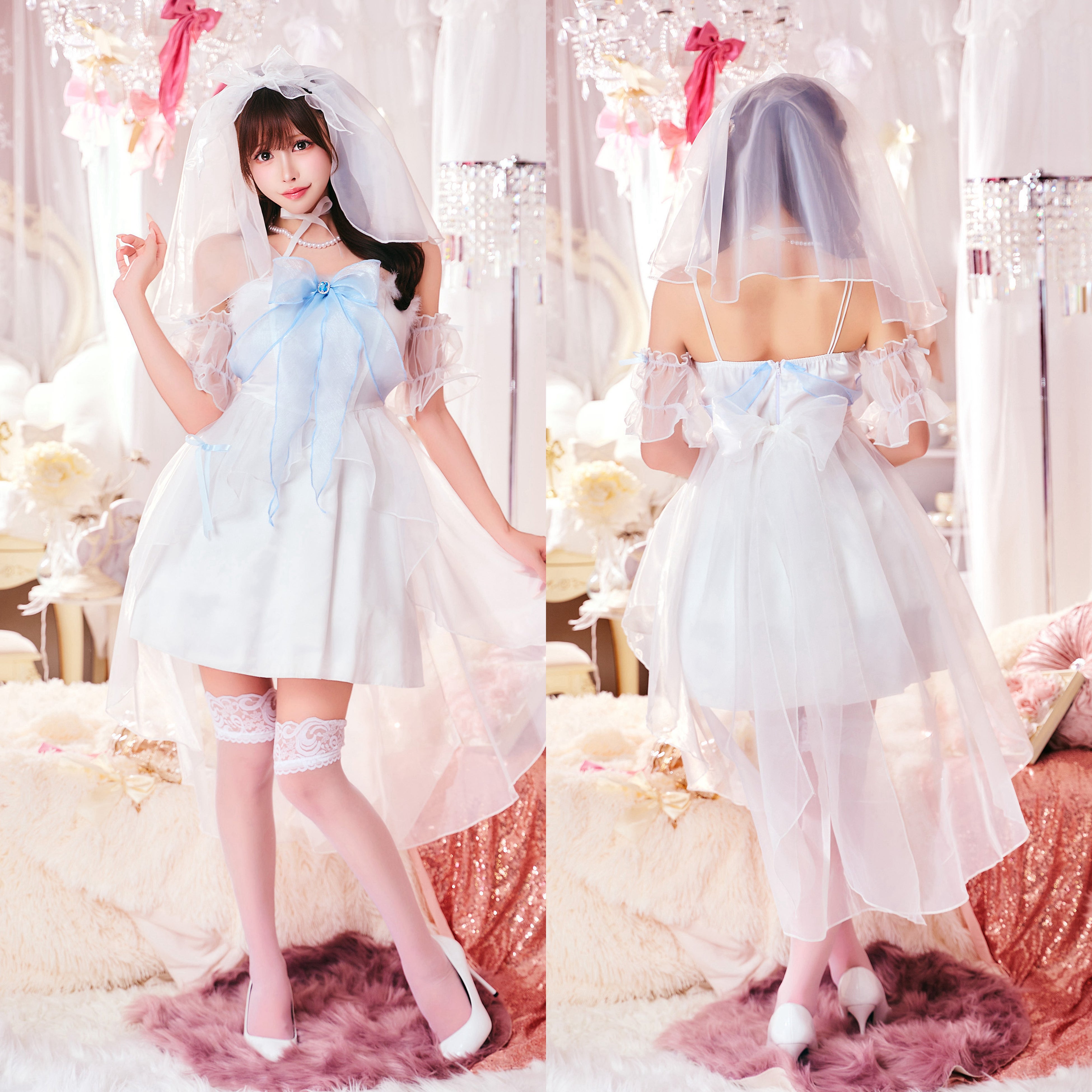 ロングテール仕様で存在感のあるブライドコスチューム。首元にはパールとリボンを重ねた二重チョーカーをあしらい、華やかさを引き立てています。
