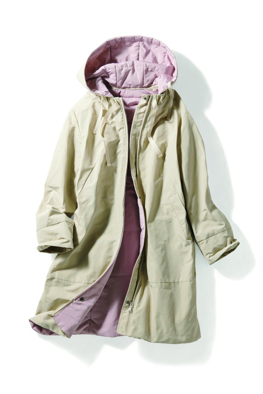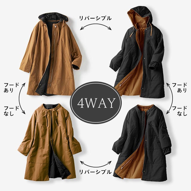 フードのあり/なし&リバーシブルで、合計4つの表情が楽しめるマルチコートが新たに登場。すっきり女性らしいAラインに、首元のギャザーやグログランのコードが上品さをプラス。フード付きだとアクティブ&カジュアルな印象で、フードを取り外すと上品なノーカラーに変身。着まわし力抜群の一着です。