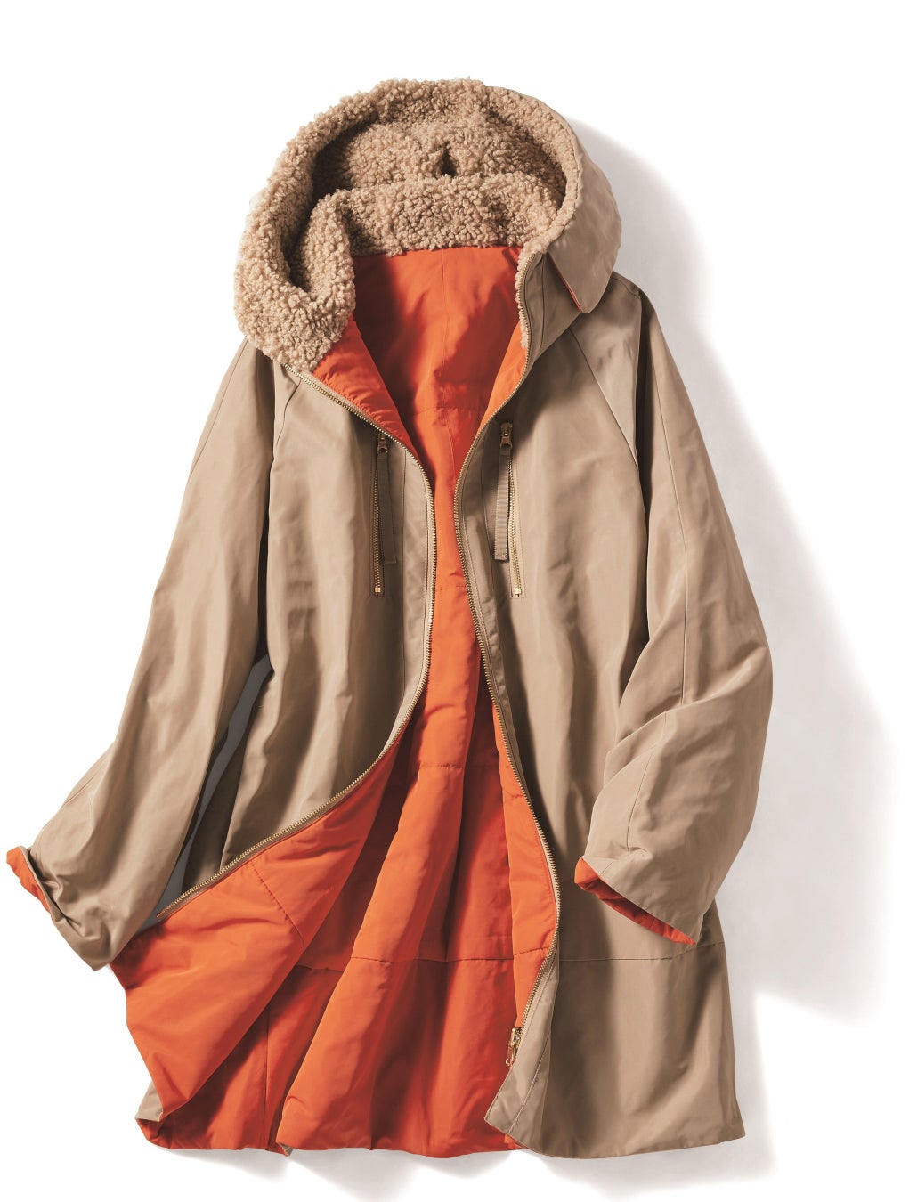トレンドのボアをフードにあしらった、オシャレで可愛らしいデザインが新たに登場。上質感のあるグログランの表地や、顔まわりをすっきり見せる立体デザインなど、大人が素敵に着こなせる工夫が満載。1枚で2着分の、着こなしが楽しめるリバーシブル仕様です。