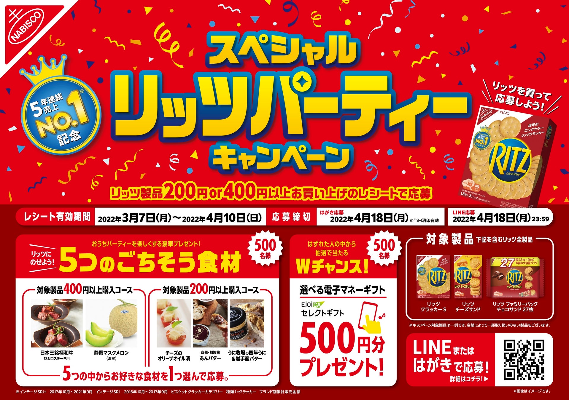 5年連続国内売上No.1*1を記念し、5つのごちそう食材が当たる「スペシャルリッツパーティーキャンペーン」を2022年3月7日(月)より実施します。日本三銘柄和牛や静岡マスクメロン、京都老舗店の餡バター、岩手産のうにバターなど厳選された豪華な食材が勢ぞろい。リッツクラッカーとも相性抜群で、おうちパーティーをスペシャルに演出できること間違いなし!また、抽選に外れた方にも、再度抽選でEJOICAセレクトギフト(500円分)を500名様に当たるWチャンスがあります。