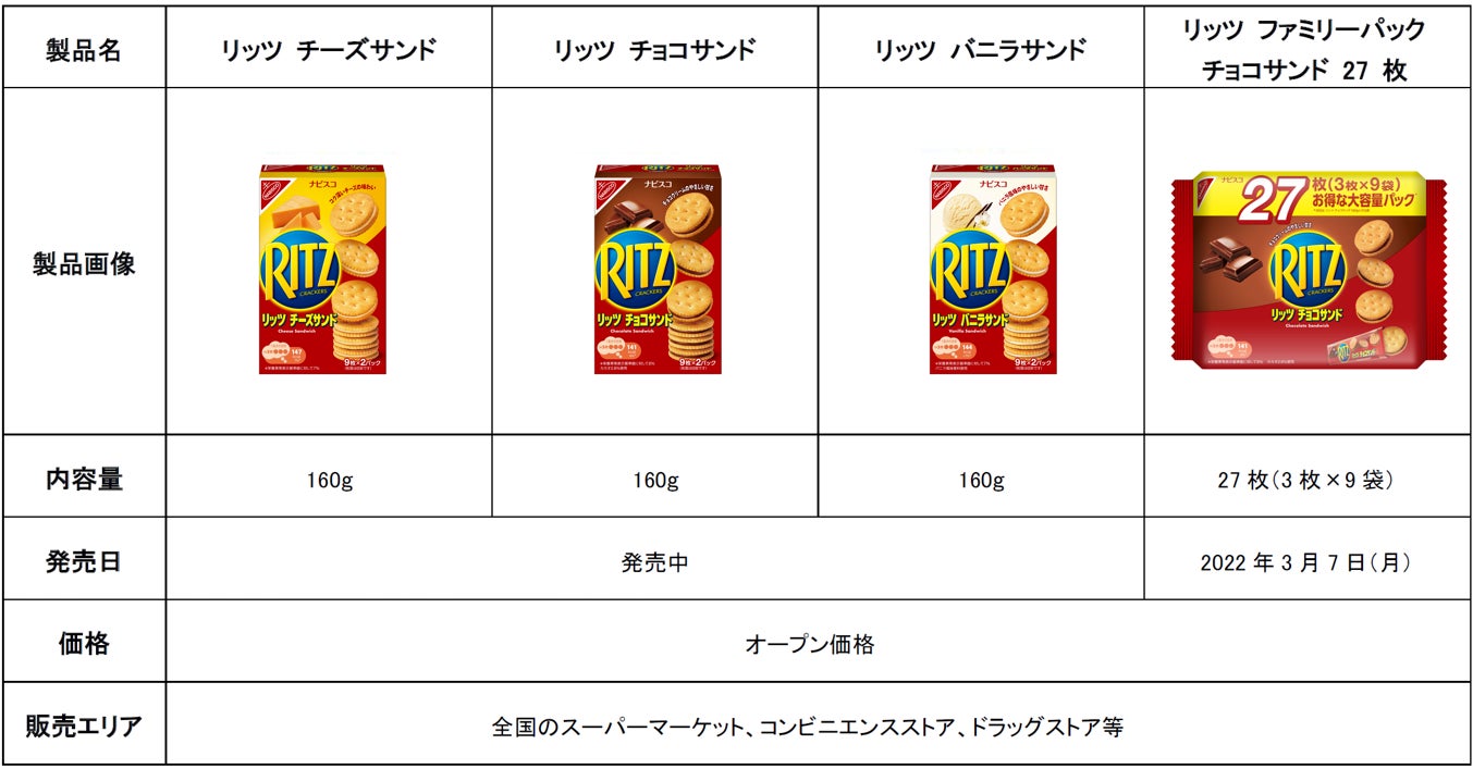 モンデリーズ・ジャパン株式会社(本社:東京都品川区/代表取締役社長:福本千秋)は、クラッカーブランド「リッツ」より、「リッツ ファミリ―パック チョコサンド 27 枚」を、2022年3月7日(月)より全国のスーパーマーケット、コンビニエンスストア、ドラッグストアなどで販売開始します。