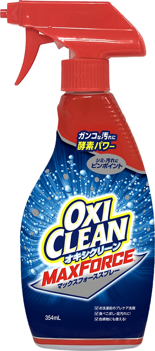 酵素と汚れを落とす成分がプラスされた「オキシクリーン マックスフォース スプレー」。濃密ジェルがジュワッと浸透し、頑固なシミ汚れや、泥汚れ、血液、食べこぼしもスッキリ!困った汚れには、酵素のパワーでアプローチ!漂白剤が使用できない衣類、色柄物の衣類にもご使用いただけます。