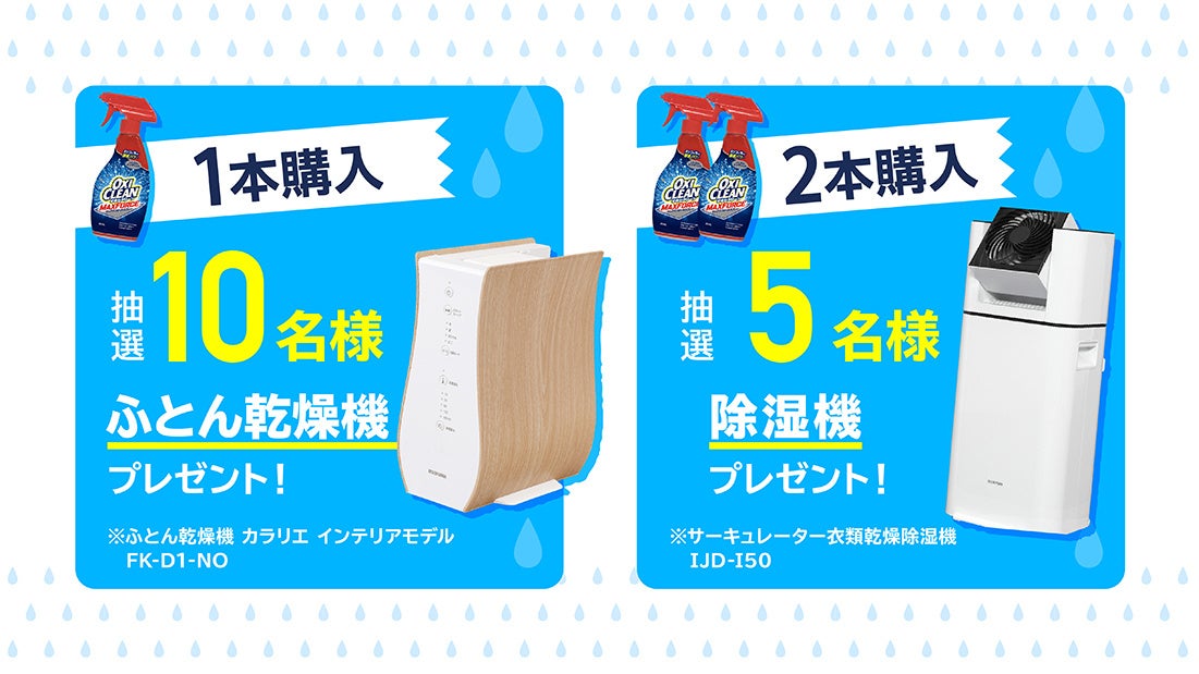 対象商品「オキシクリーン マックスフォース スプレー」の購入数に応じて応募コースをお選びいただけるプレゼントキャンペーンです。抽選で合計15名様に、梅雨の湿気対策で人気の家電が当たります。