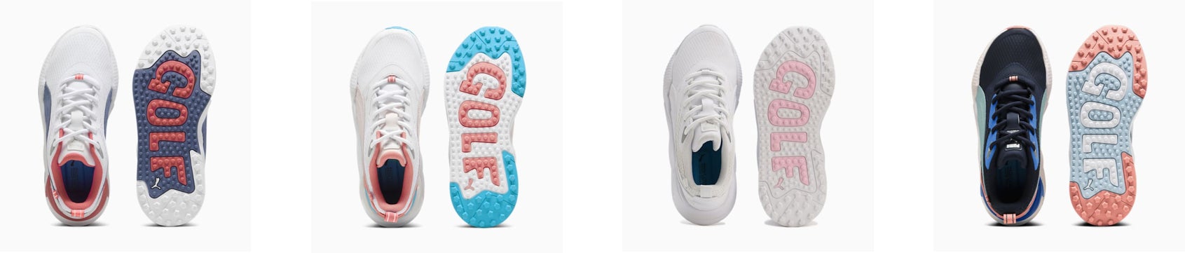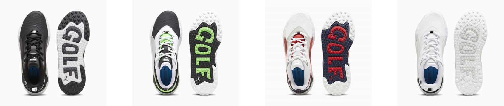 コンセプトは「厚底シューズに合うニュースタイリング」となっております。プーマの⼤⼈気商品となっている厚底スニーカーをインスパイアした厚底ゴルフシューズに合うデザイン、カラー、シルエットが最⼤の特⻑です。また 24 年春夏より厚底ゴルフシューズがバージョンアップ。GS X エフェクトと新たに名前も変わり、アッパーがメッシュ素材となり、カジュアルスタイルに合わせやすく、フィット感が向上しました。ゴルフシューズとしての機能性を発揮しながら、オンオフどちらでも履けるスタイリッシュなゴルフシューズとなっております。