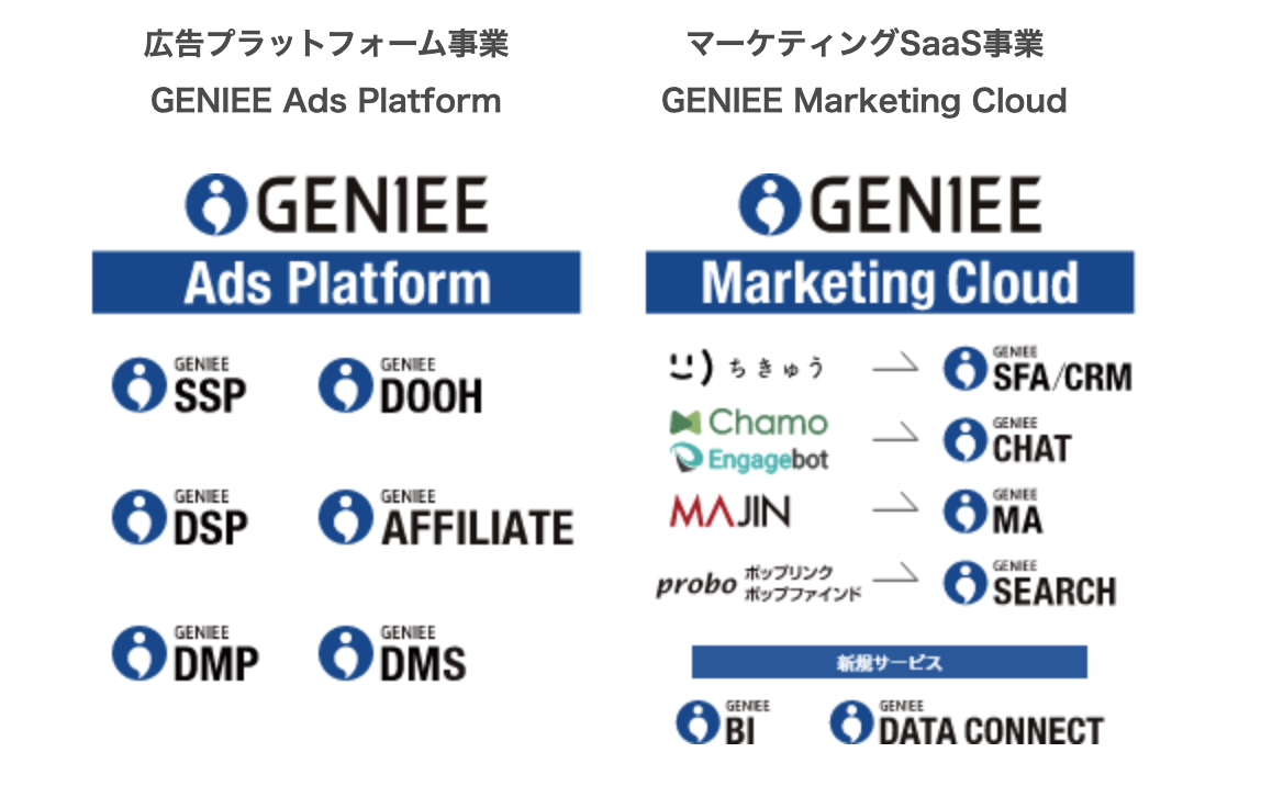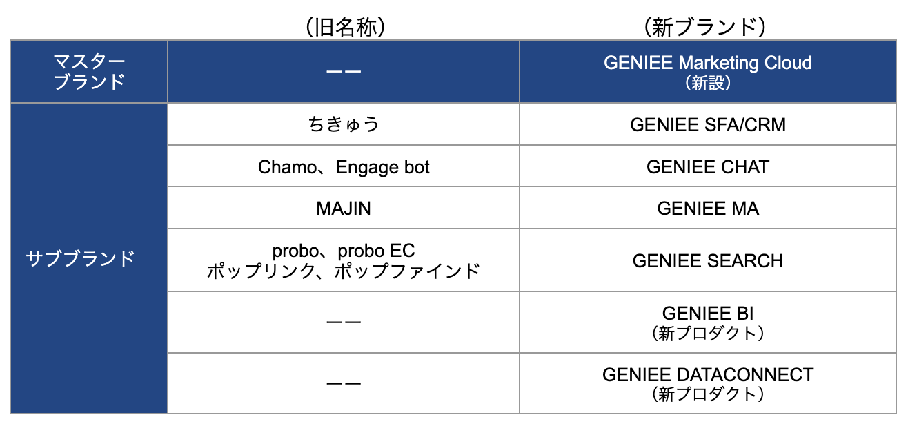 ジーニーは、2010年の創業以来、広告プラットフォーム事業で市場シェアを獲得し、2016年以降はデジタルマーケティングツールの開発に着手し、提供ツールの拡充(サイト内検索エンジン、チャットツール、MA、SFA/CRM、BI)を進めてきました。今回、サービス体系を見直し、2つの新ブランドに各種プロダクトを統合することで当社サービスの提供を促進し、日本とアジア企業のマーケティング活動支援・企業の業績向上に貢献してまいります。