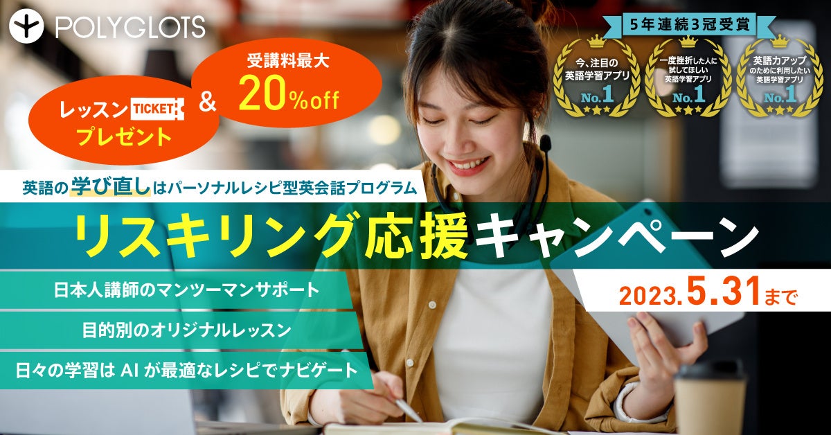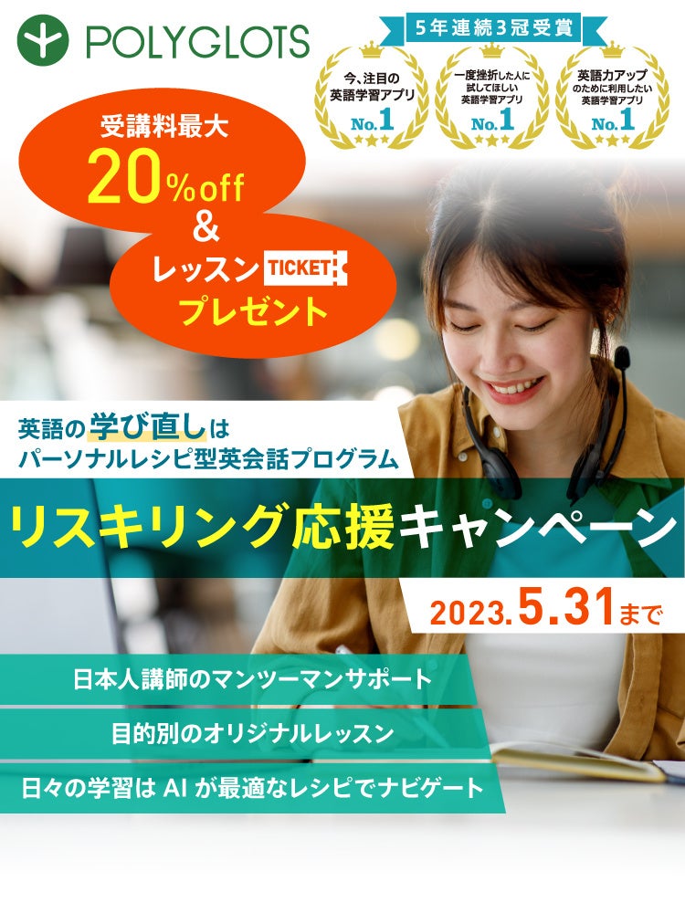 株式会社ポリグロッツ(本社:東京都新宿区、代表取締役:山口隼也)は、5月15日(月)~5月31日(水)まで英語の学び直しを後押しするリスキリング応援キャンペーンを開催いたします。開催期間中は、パーソナルレシピ型英会話プランを最大20%OFFでご提供します。さらに、レッスンチケットもプレゼント!このお得な機会に、英語学習を強化してください。
