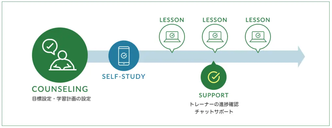 また、週に1回のチャットカウンセリング、月に1回のオンラインレッスン&カウンセリングでトレーナーから学習状況の確認・相談をいたします。学習状況の進捗も随時確認しているので、進捗に応じたコメントやアドバイスをもらい、モチベーションを保ちながら学習を進めることができます。