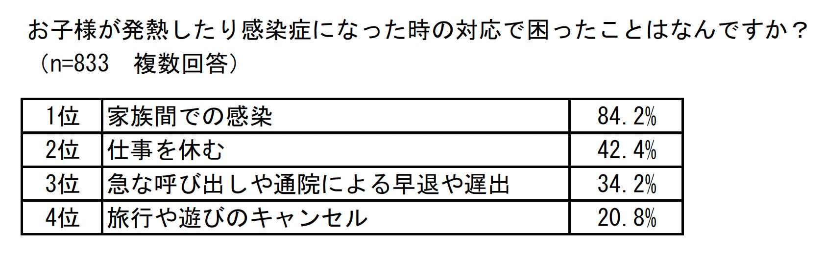 対応で困ったこととして、1位は「家族間での感染」、2位は「仕事を休む」、3位は「急な呼び出しや通院による早退や遅出」でした。その他の回答として、「休日・夜間で受診先の病院がない」「熱性痙攣が起こった」「泣いて眠れない」「ワンオペ育児になる」など、さまざまな困りごとが明らかになりました。