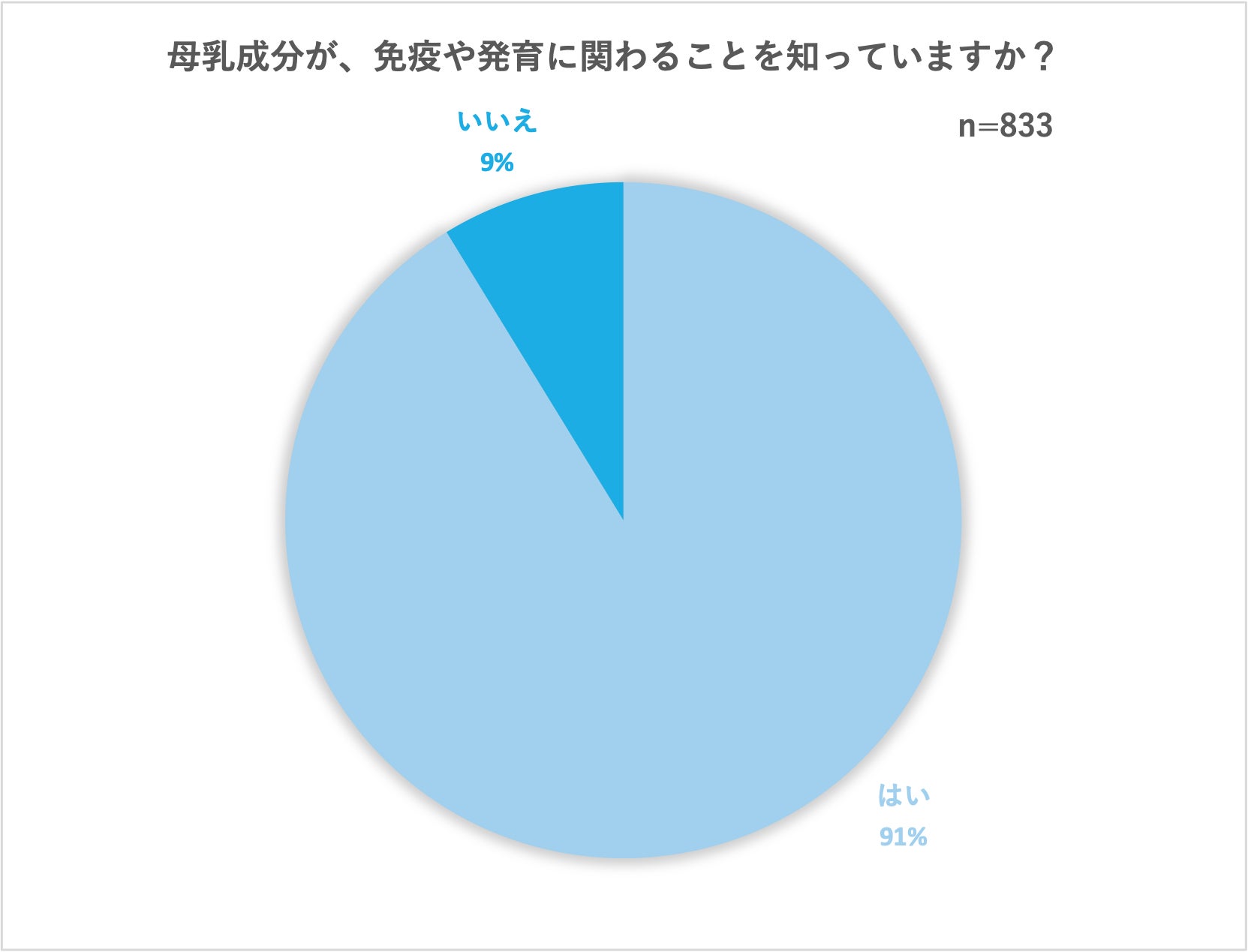 お子様の免疫と母乳の関係性について調査したところ、母乳成分が免疫や発育に関わることを知っている人は、全体の91%となりました。