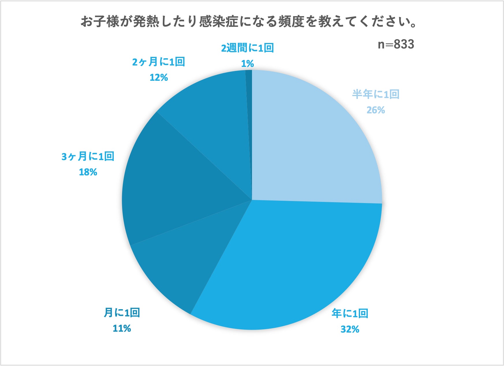 お子様が発熱したり感染症にかかる頻度は「年に1回」が32%、「半年に1回」が26 %。ついで、3ヶ月に1回が18%、2ヶ月に1回が12%でした。