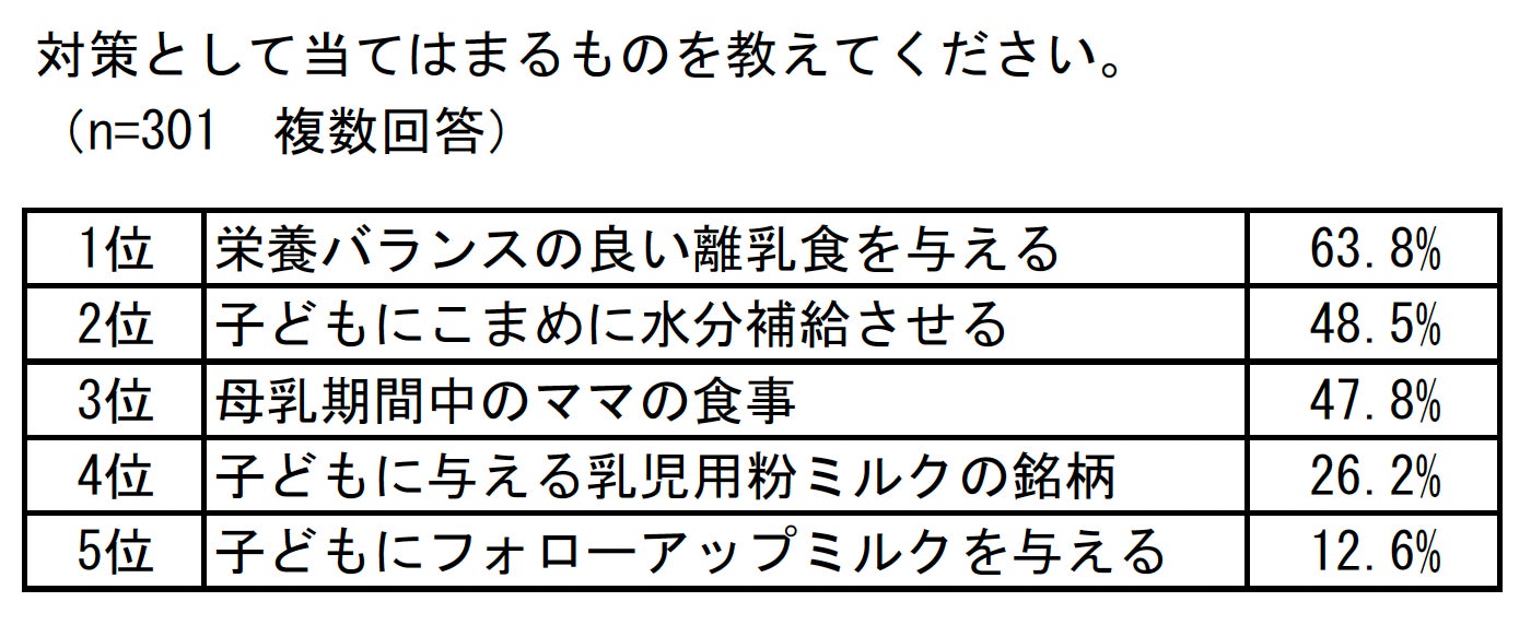 対策の1位は「栄養バランスの良い離乳食を与える」、2位は「子どもにこまめに水分補給させる」、