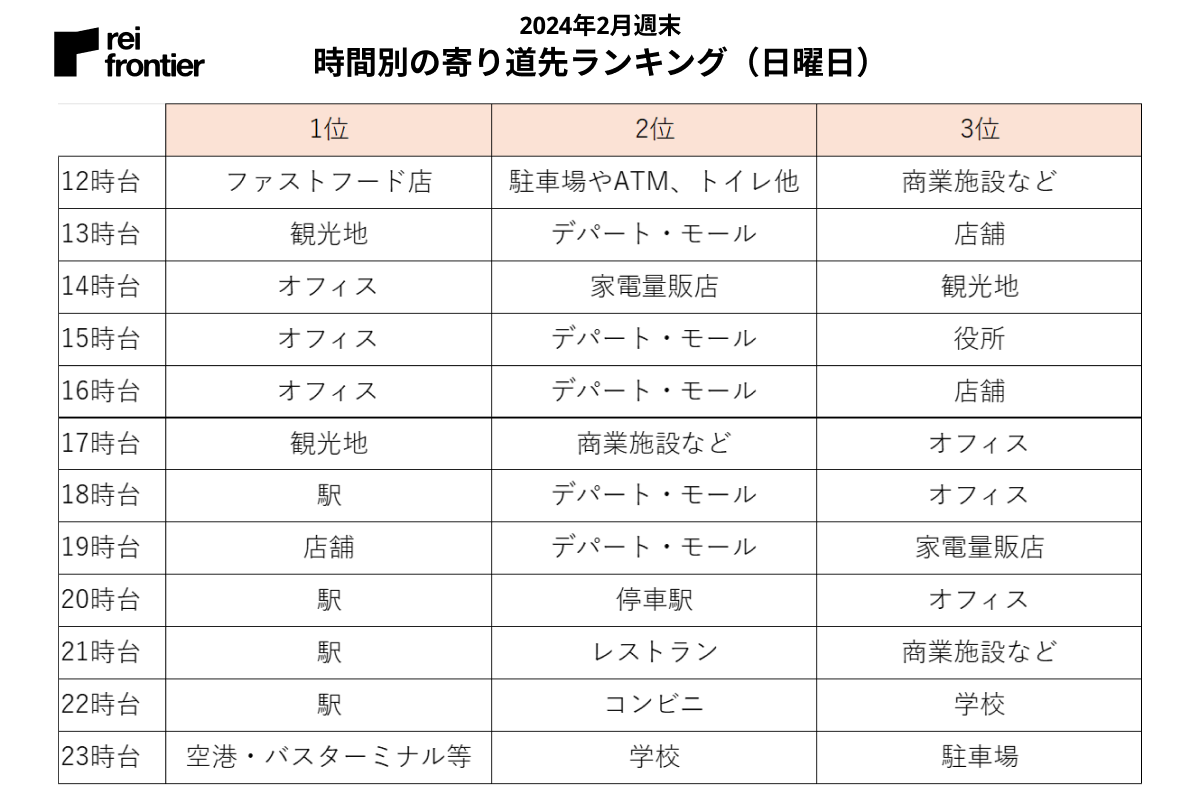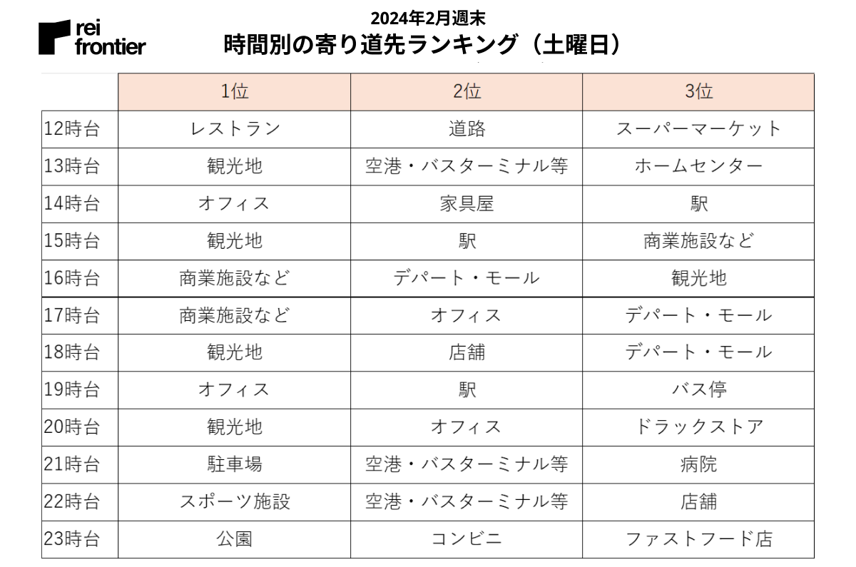 それ以外の時間帯に「観光地」「オフィス」「駅」が上位に入っています。