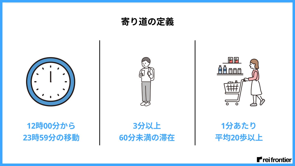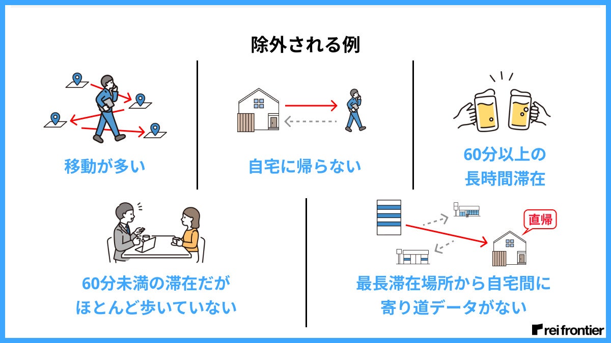 除外される例 | ・営業など移動ばかりの人 ・自宅に帰らない人 ・長時間滞在(目的地であって寄り道先とは考えない:飲み会など) ・3分以上滞在するがほとんど歩かない(カフェで時間つぶしなど) ・直帰「職場 or 最長滞在場所」から自宅の経路において寄り道がない(検知されない)経路の場合 |
