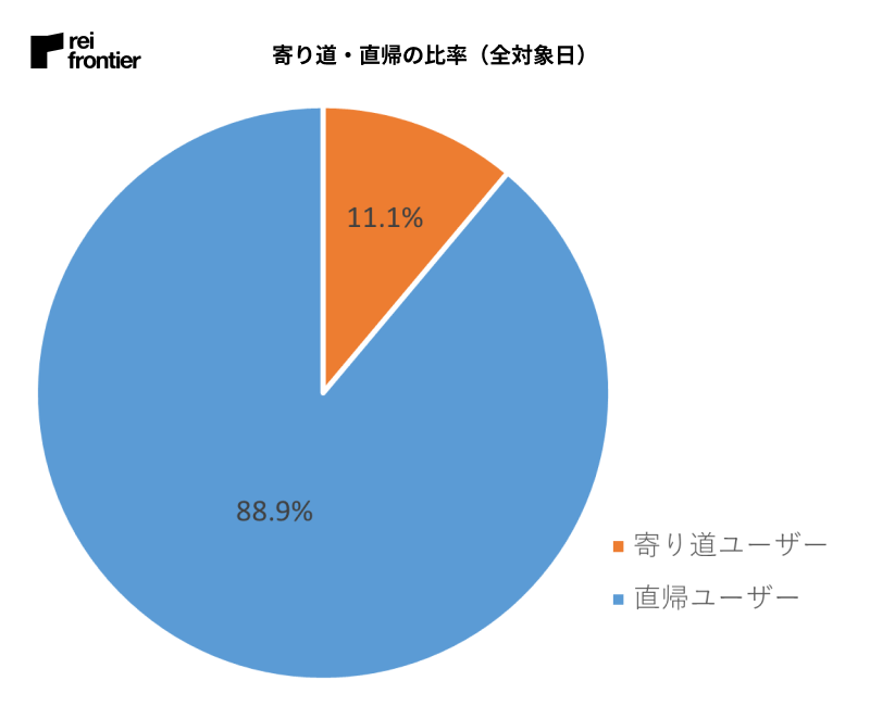 寄り道と直帰のユーザーを比較したところ、寄り道比率(全対象日)は11.1%でした。