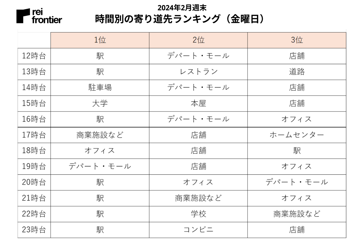 夕方あたりから「商業施設」「デパート・モール」が1位にランクインしていることから、仕事終わりや昼の予定が終わって帰宅までの間に買い物などで寄り道をしている様子が推測できます。