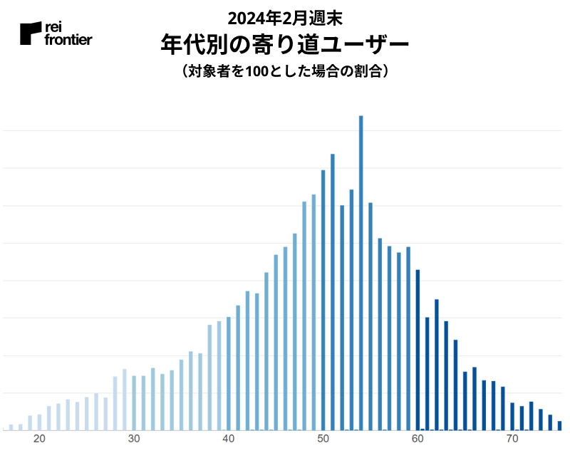 対象ユーザー全体では50代が多かったですが、寄り道ユーザーの結果から20代、30代、40代の寄り道率が高いです。70代は少ないサンプルでしたが、調査対象者がアクティブな高齢者だった可能性を推測します。